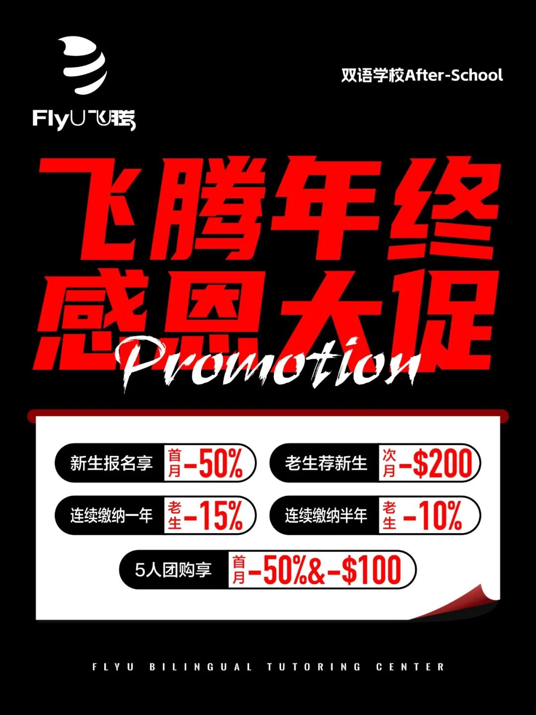 FlyU飞腾丨年终感恩大促,福利满满!Issuing time:2024-12-25 15:21 在这个温馨的年终时节,FlyU飞腾为回馈广大新老学员的厚爱与支持,特别推出了年终感恩大促活动! 推荐新生福利: 老生推荐新生入学,次月学费立减$200! 5人团购特惠: 老生连缴优惠: ![]() 飞腾双语学校期待您的到来,与孩子们一起在这里共同成长,创造美好的未来。 ![]() ![]() 飞腾双语 AFTER-SCHOOL 欢迎来自各国不同文化背景的孩子加入 ![]() SAN JOSE校区 学校地址: 1715 Lundy Ave, Suite 128, San Jose, CA 95131 ☎️电话号码: (408)452-7999 (Mon-Fri 10:00-19:00) Wechat ID: feikungfu ![]() FREMONT校区 学校地址: 37371 Fremont Blvd, Fremont, CA 94536 ☎️电话号码: (510)979-9886 (Mon-Fri 10:00-19:00) Wechat ID: feikungfu ![]() Website: ustfg.com |