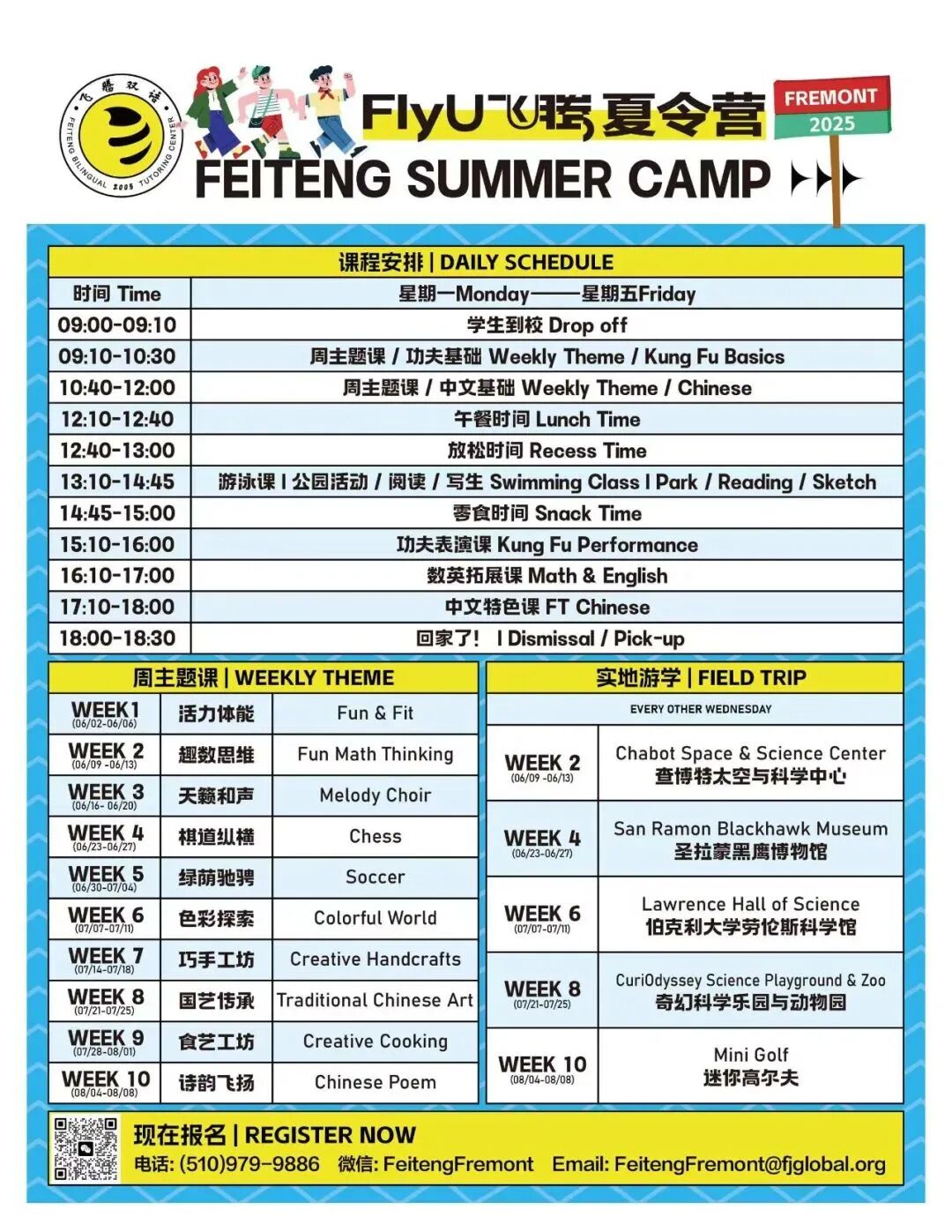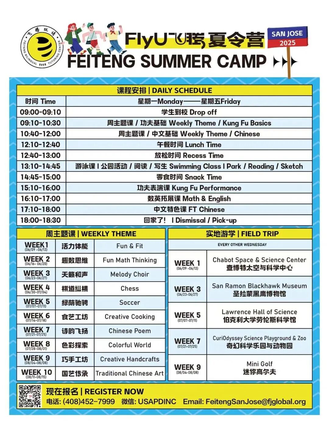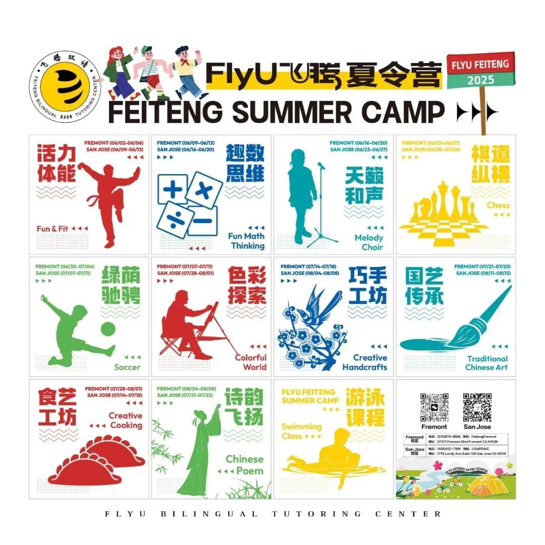 FlyU飞腾第七周主题成长课堂:诗韵飞扬Issuing time:2025-08-14 10:00 ![]() 诗韵飞扬:从诗韵到传统文化 聆听穿越时空的韵律之美,细细品味古诗的华美与深邃;FlyU飞腾老师以深厚的诗词功底,引导学生在古人的智慧与情怀中汲取成长养分,培育美好心灵。 同时课堂上,还有很多其他可以触摸中华文明基因的小环节。 "日"字像一轮朝阳,"山"字如层峦叠嶂——中文课上,孩子们通过打印的甲骨文图片,解锁汉字演变的密码。老师带着他们诵读《山海经》,他们热烈地讨论《山海经》中的神兽。 ![]() ![]() ![]() ![]() 除了诗韵飞扬外,FlyU飞腾合理安排短途旅行验、创意美术、体能挑战等多元环节,围绕“学习、体能、文化”三大方向来帮助孩子全面发展,让孩子们在游戏中激发潜能。“玩中学、学中乐”,欢声笑语中记录着成长的印记。 智启未来:跨学科学习能力培养 FlyU飞腾数学课 在数字的奇妙世界里,每个孩子都是天生的探险家。FlyU飞腾的数学课程不是枯燥的公式堆砌,而是一场思维狂欢——通过沉浸式游戏化教学,让孩子在解谜闯关中建立数感,在几何搭建中理解空间,用生活场景模拟培养逻辑力。课程融合新加坡教学法,让孩子们在快乐中掌握「数学思维」这把万能钥匙。 ![]() ![]() ![]() ![]() ![]() ![]() FlyU飞腾英文课 英文课上,孩子们通过互动游戏、英文儿歌和情景对话,不知不觉中就掌握了不同词汇的应用。每个孩子都能在轻松氛围中找到学习英语的乐趣。 ![]() ![]() ![]() ![]() ![]() ![]() 运动精英:体能发展与运动智能 充气城堡 每个周的彩虹城堡滑梯都是孩子们最喜欢的游乐场。顺着光滑的斜坡俯冲而下,风吹起孩子们的衣角,落地时溅起一片欢腾的笑声。彩虹滑梯城堡让孩子们的快乐像永不熄灭的小太阳,在滑梯上、在笑声中熠熠生辉。FlyU飞腾深知劳逸结合才能帮助孩子更好的成长。 ![]() ![]() ![]() ![]() ![]() ![]() 室外活动 FlyU飞腾通过户外实践打破传统课堂边界,让孩子们在游戏里、社交里、生态里,提升沟通能力与问题解决能力。孩子们能投身于户外丰富多彩的运动项目。在专业老师的悉心指导下,尽情奔跑、跳跃,身体协调性与运动能力在玩乐中飞速提升,身体素质越来越好。 ![]() ![]() ![]() ![]() ![]() ![]() 文化浸润:全球视野与本土认同 加州的短途旅行 加州奇幻科技乐园与动物园,位于加州圣马特奥县。互动式科学游乐场,满足了孩子们的科学启蒙,在他们好奇的眼睛里,播下了探索世界的种子。在动物园里,孩子们近距离观察本地和非洲的野生动物,一个个变身小小动物探险家。 ![]() ![]() ![]() ![]() ![]() ![]() 营养午餐 一份健康的午餐,不仅是能量的补充,更是对孩子们成长的关怀与呵护。蒸腾的热气混合着米饭的清香与蔬菜的鲜甜,驱散了孩子们半日学习的疲惫。FlyU飞腾守护他们的每一餐,为他们的未来添一份活力与健康! ![]() ![]() ![]() ![]() ![]() ![]() 这一周,孩子们在甲骨文和山海经里看见文明,在加州的动物园里探险,更在充气城堡的欢声笑语中收获友谊。我们相信,最好的教育是让孩子在触摸过去时拥抱未来。 有爱的FlyU飞腾大家庭 The loving FlyU family ![]() ![]() ![]() ![]() ![]() ![]() ![]() ![]() ![]() ![]() ![]() ![]() ![]() ![]() ![]() ![]() ![]() ![]() ![]() ![]() ![]() ![]() ![]() ![]() ![]() ![]() ![]() FlyU飞腾秋招活动火爆启动中,名额不多,欢迎咨询! ![]() FlyU飞腾夏令营 ![]() FlyU飞腾夏令营,每周一个不同的主题,让孩子在这个暑假中度过充实而难忘的时光。两周一次Field Trip,带领孩子们走出课堂,亲身体验和感受世界,让学习更加生动有趣。更有为孩子们额外安排的专业游泳课程,小班上课,一个暑假可以熟练掌握游泳技能。 招生年级:TK-Grade 7 【Fremont Site】 时间:6/2-8/8 共10周 周一至周五,9:00am—6:30pm 学校地址: 37371 Fremont Blvd Fremont, CA 94536 报名链接: https://forms.gle/NK6gs8JLum4ZZGKcA ![]() 长按识别二维码报名 【San Jose Site】 时间:6/9-8/15 共10周 周一至周五,9:00am—6:30pm 学校地址: 1715 Lundy Ave, Suite 128, San Jose, CA 95131 报名链接: https://forms.gle/C1nUqwsnJbyQX6cR8 ![]() 长按识别二维码报名 ![]() ![]() ![]() ![]() FlyU飞腾双语 AFTER-SCHOOL 欢迎来自各国不同文化背景的孩子加入 ![]() ![]() SAN JOSE校区 学校地址: 1715 Lundy Ave, Suite 128, San Jose, CA 95131 ☎️电话号码: (408)452-7999 (Mon-Fri 10:00-19:00) Wechat ID: feikungfu ![]() FREMONT校区 学校地址: 37371 Fremont Blvd, Fremont, CA 94536 ☎️电话号码: (510)979-9886 (Mon-Fri 10:00-19:00) Wechat ID: feikungfu ![]() Website: www.flyu.us |
