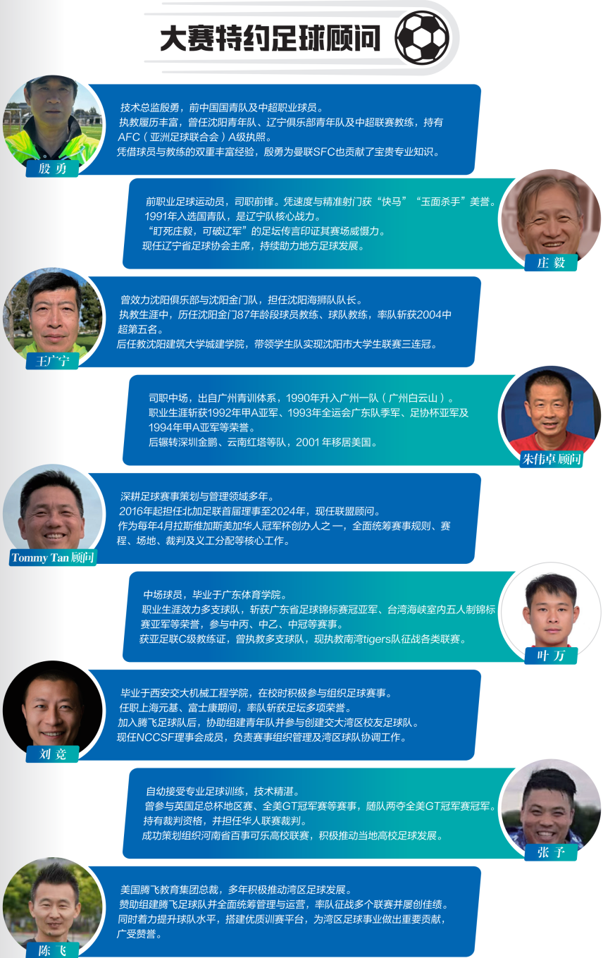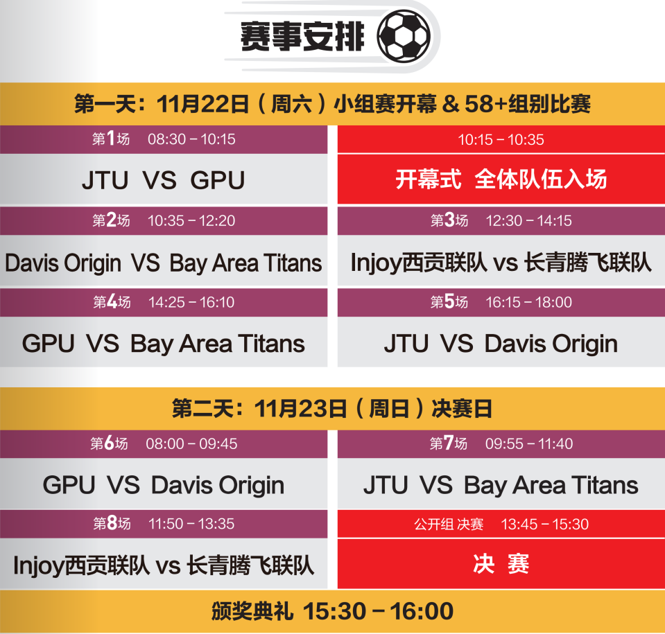 【君子好球,溯源绿茵】—— 2025北加州华体会足球大赛全面启动Issuing time:2025-11-21 16:05 团结拼搏 ![]() 奋斗昂扬 北湾绿茵战火将燃,六路豪强竞逐王座! 北加州华体会倾力巨献,八大权威顾问坐镇,全城媒体聚焦,11月盛宴邀您见证! ![]() 国际足联曾郑重认证:足球的文明基因,源自中国蹴鞠。 两千年前,蹴鞠在华夏大地上绽放;两千年后,这份对足球最原始的热爱,远渡重洋,在北美湾区迸发新的活力。 ![]() 这个秋天,北湾区的绿茵场,注定因激情而沸腾!由北加州华体会主办的2025北湾区足球邀请赛,将于11月22日至23日,在红木城田径赛场震撼上演! 一场汇聚社区力量、闪耀足球梦想的巅峰对决,即将拉开战幕。 六路豪强列阵 ![]() 锋芒尽显 战鼓未响,硝烟已起。 六支来自湾区的顶尖球队已集结完毕,他们将为了共同的目标——冠军荣耀,展开为期两天的激烈厮杀。每一支队伍都带着独特的风格与不败的信念: ![]() Davis Origin: 十余年沉淀的北美元老学生劲旅,“与子同袍,百日无霜”是他们信任与团结的誓言。 ![]() 交大硅谷足球队 (JTU): 以“饮水思源”为信念,在异国他乡打造奔跑的校友精神家园。 ![]() GPU球队: 以香港朋友为核,从多年友谊赛迈向正式联赛的快乐之师,默契如家人。 ![]() Injoy西贡联队: 由58+资深爱好者组成,为享受同代人间公平竞技的纯粹快乐而战。 ![]() Bay Area Titans (湾区铁人): 为兄弟情义而战,信奉“兄弟同心,其利断金”的热血军团。 ![]() 长青腾飞联队: 由腾飞教育集团荣誉支持,以“志存高远,勇往直前”为信条的活力之师。 ![]() 谁将问鼎北湾?悬念,留待赛场揭晓! 八大顾问天团 ![]() 权威守护 我们坚信,顶级的赛事需要顶级的专业标准保驾护航。本届大赛荣幸地邀请到八位资深足球界泰斗,组成有史以来最强大的特约顾问团。他们的专业视野与丰富经验,将确保赛事的每一个环节都秉持公平、公正、专业的最高准则。 【荣耀顾问团】 殷勇 (前中国国青/中超球员,AFC A级教练) 王广宁 (前沈阳海狮队长,大学生联赛冠军教头) 朱伟卓 (前广州白云山队名将,甲A联赛功勋) 庄毅 (前辽足核心、“玉面杀手”,现辽宁省足协主席) 张予 (全美GT冠军赛冠军,赛事策划人) 刘竞 (NCCSF理事,资深赛事组织者) Tommy Tan (北加足联顾问,美加华人冠军杯创办人) 叶万 (亚足联C级教练,南湾tigers队主帅) 陈飞 (腾飞教育集团总裁,湾区足球推动者) ![]() 赛事日程纵览 ![]() 第一天 (11月22日,周六): 小组赛激战开幕!58+组别比赛同步上演,全天5场对决,揭开争冠序幕。 第二天 (11月23日,周日): 决战之日!小组赛收官后,公开组决赛将于13:45准时打响,巅峰对决后,将于15:30举行盛大的颁奖典礼。 ![]() 聚力同行 ![]() 感谢鼎力支持 这场社区盛事的成功举办,离不开社会各界的广泛支持。我们由衷感谢以下合作伙伴的慷慨相助,他们的名字将与赛事的光辉同在: 赞助商联合呈现: 由衷感谢以下合作伙伴的鼎力支持(排名不分先后): 西贡渔港、天下卫视、先锋汽修、方太 (FOTILE)、摩根地产贷款 (Morgan Real Estate & Financial)、Meridian Keystone地产、车辆租寄服务(Ready Ready Motors)、ShipSage海外仓、山城私房菜、元宝饺子、慧算账、Ace King BBQ、金鹰搬家、熊猫地毯/地板、Firstday复合维生素、盛世旅游、FlyU飞腾…… 同时,特别感谢战略合作媒体 天下卫视 (Sky Link TV) 的全程聚焦与报道,让赛事精彩传递千家万户。 ![]() 正是你们的信任,共同铸就了这场社区盛事的舞台。 最终号召 ![]() 这是一场关于足球的庆典,更是一次社区的盛大聚会。奖杯已经就位,英雄即将登场! ![]() 我们诚挚地邀请您,加入我们: 赛事: 2025北加州华体会足球大赛 时间: 2025年11月22日- 23日 地点: 红木城田径场 观赛: 免费向公众开放,欢迎全社区莅临! 让我们共同汇聚于此,见证汗水、拼搏、友谊与荣耀!共同期待,北湾新王的加冕! 主办单位: 北加州华人文化体育协会(足球处) 总策划: 董毅 执行总监: 杨珂 协办单位: 福济基金会 最终解释权归2025旧金山湾区华体会足球大赛组委会所有。 |